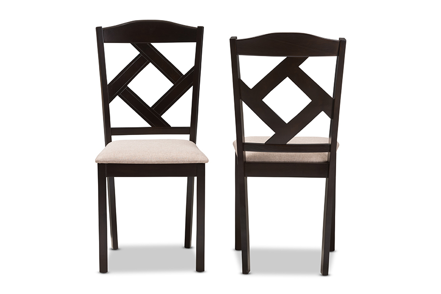 Perfect for everyday dinners with family or indulging in a catch-up coffee and cake with friends, the Emiko set of two dining chair set features practical casual dining chairs for compact spaces. Constructed of solid rubberwood, this dark brown finished dining side chair features geometric design on the chair back for a modern and contemporary look. Sand polyester fabric upholstered seats, foam-filled guarantee for ultimate seating comfort while you enjoying and relaxing with family and friends. Made in Malaysia, this sturdy dining chair set requires assembly.