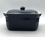 Offered is this Emile Henry 58-91 Baking Dish w/Lid in dark blue. It measures approx 7 1/2" length, 5" height and 5 1/2" wide. In good pre owned condition with no cracks or repairs with 2 interior lid chips and normal vintage wear (see images). This oven-safe dish is easy to clean and dishwasher safe, making it a convenient addition to any kitchen. The ceramic surface coating ensures even heat distribution for perfectly baked goods every time. Perfect for baking and serving a variety of dishes, this Emile Henry baking dish is a high-quality and stylish option for home cooking.