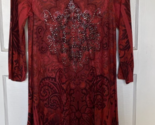 Emma Rose Mandela Patterned Dress with Gem Stud Accents Size XL. Elegant reddish brown dress featuring intricate patterns and shiny accents. Perfect for a stylish look. 96% Polyester and 4% Spandex. Dry Clean. Armpit to armpit measures 18?. Shoulder to hem is 35.5-41?. Sleeves measure 21? from the top of the shoulder seam to hem. Very Good Used Condition - See photos for further description.