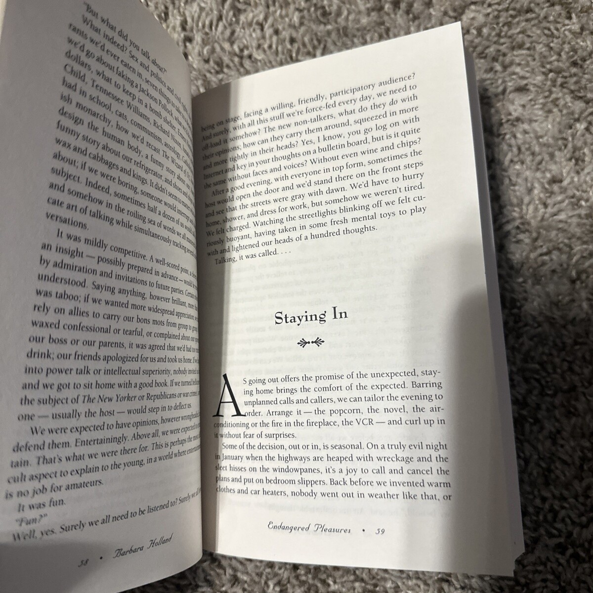 "Endangered Pleasures: In Defense of Naps, Bacon, Martinis, Profanity, and Other Indulgences" by Barbara Holland is a hardcover book published by Little Brown Company in 1999. The book, with 175 pages, explores the topic of customs and traditions and offers a self-help perspective on embracing and enjoying various pleasures in life, such as napping, eating bacon, sipping martinis, and using profanity. Illustrated by the author, this book encourages readers to defend these indulgences that have become endangered in today's society.