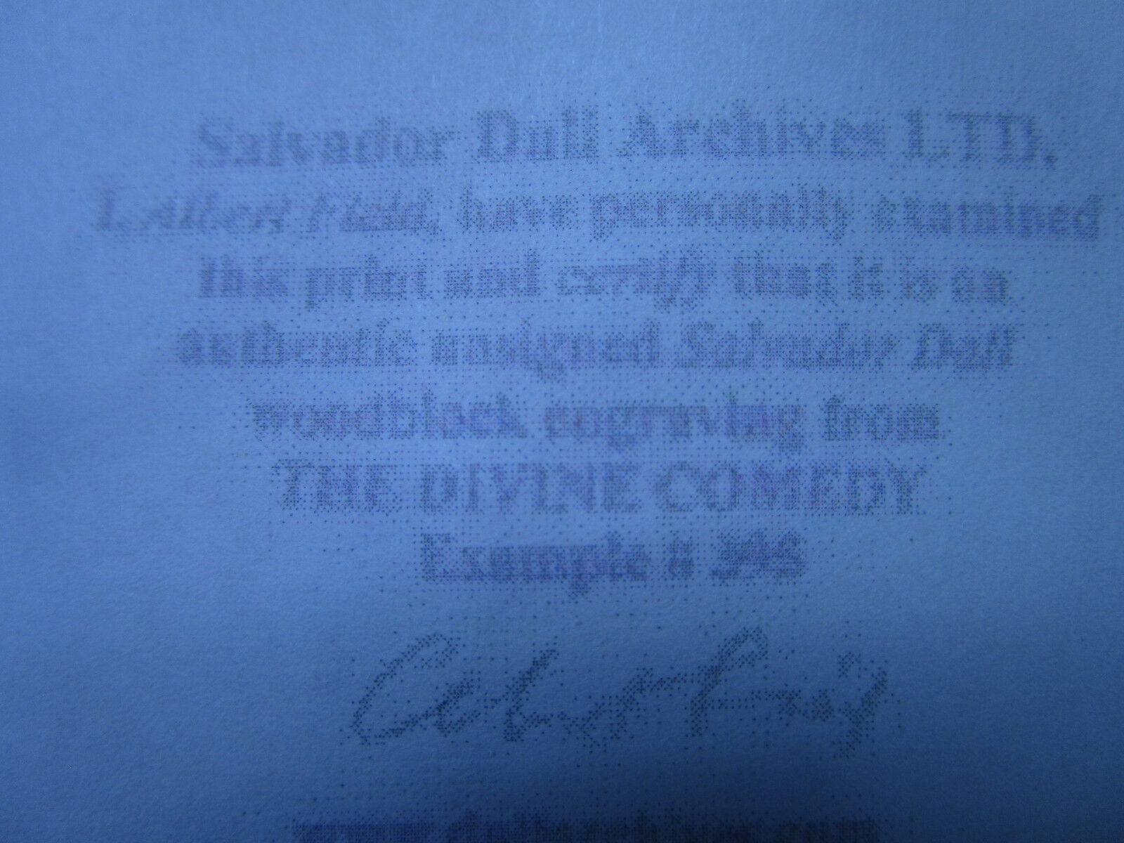 ENEFER 18 " THE FLATTERER" WOOD BLOCK PRINT BY SALVADOR DALY, SPANISH (1904-1989) CERTIFIED ON BACK BY ALBERT FIELD. UNFORTUNATELY PREVIOUS OWNER GLUED THE PRINT TO MATTE, BUT AGAINST THE LIGHT THERE IS AN AREA WHERE CAN BE SEEN THE AUTHENTICATION SIGNED BY MR. FIELD, AUTHOR OF THE OFFICIAL CATALOG OF GRAPHIC WORK OF SALVADOR DALI. MORE INFORMATION ON ALBERT FIELD AT THE DALI ARCHIVES ON LINE. PRINT 10 X 7", 26 X 22 " FRAME