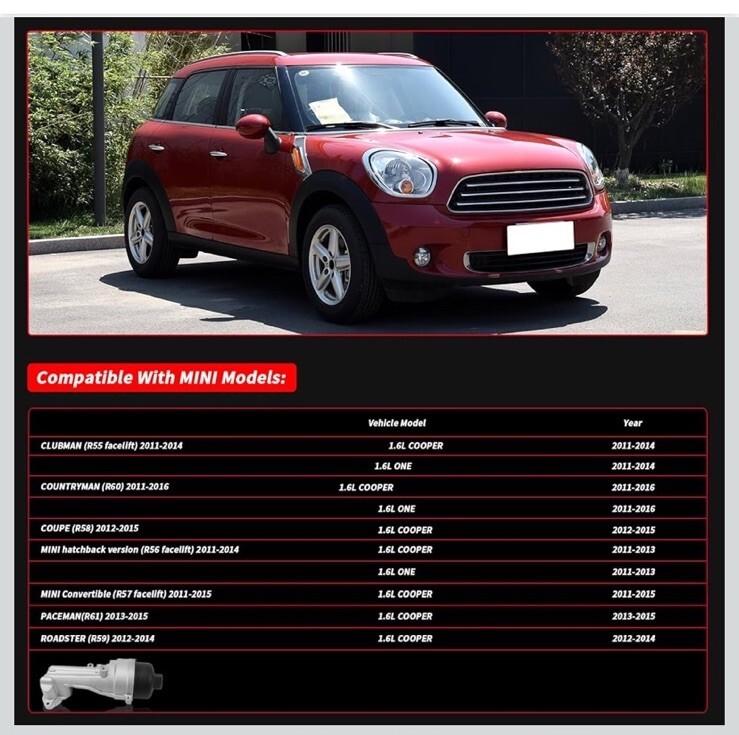 The Engine Oil Filter Housing for Mini Cooper, Cooper Countryman, and Cooper Paceman 2011-2016 is a direct replacement part that does not include a sensor. Manufactured by Bomunik, this oil filter is compatible with various Mini models and comes with a 1-year manufacturer warranty. With a California Prop 65 Warning, this product ensures quality and safety for your vehicle's engine. Please ensure compatibility before purchasing to guarantee a proper fit for your Mini Cooper vehicle.