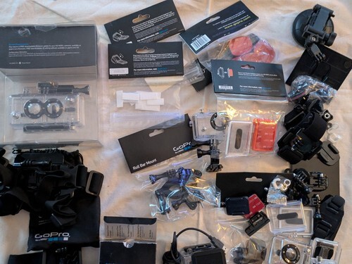 In vendita un lotto enorme di 2 fotocamere GoPro HERO 2 Silver. L'enorme lotto comprende custodie, batterie, accessori, supporti e cinghie per il corpo funzionanti.