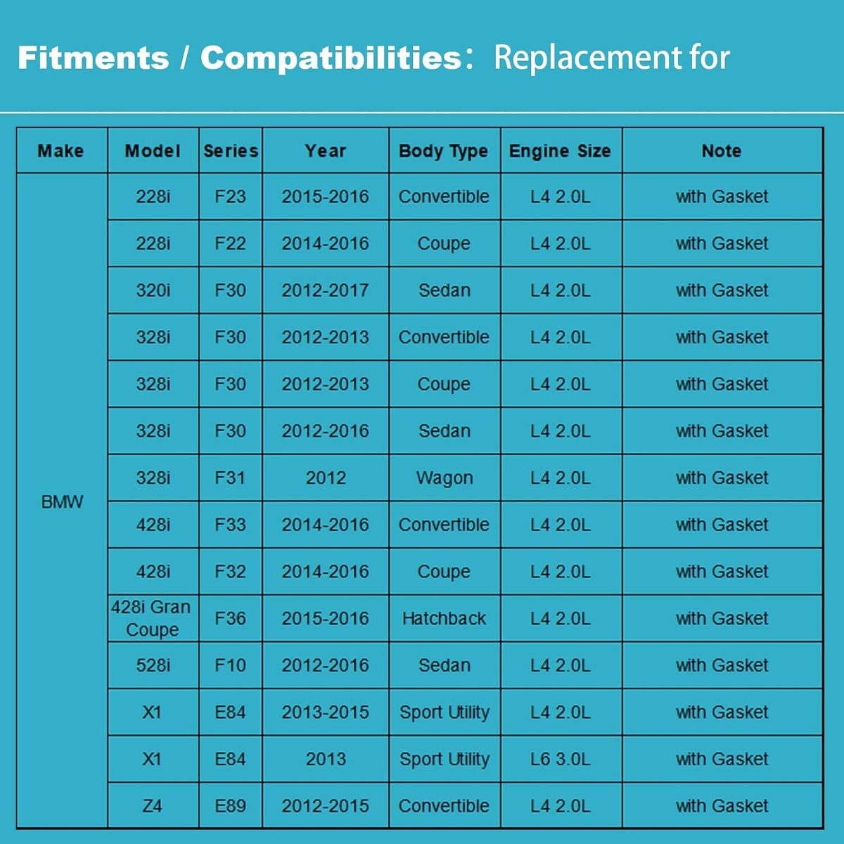 ?Premium Quality?: Engineered from OEM Pars, Meets Or Exceeds OEM Specs!!! ?Direct Fit?: Direct replacement for a proper fit and easy installation, quality materials used, meets or exceeds OEM standards, 100% tested before shipping? ?Fitment/Compatibility?: Only fit 2.0 Engine; 2014-2016 228i 428i, 2012-2017 320i, 2012-2016 328i 528i Z4, 2013-2015 X1 ?Replacement OEM ( Original Equipment Part) Number?: 11137618512 ?Buy with Confidence?: Order from Ensun, we offer a 2 Years Warranty, true worry-free shopping experience?