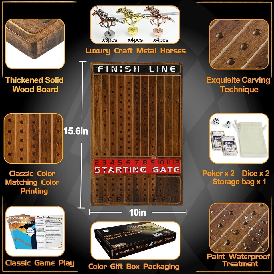 Features: Durable Board,Lifelike Metal Horses,Dice,Card Boxes,Waterproof Coating,Smooth Corners