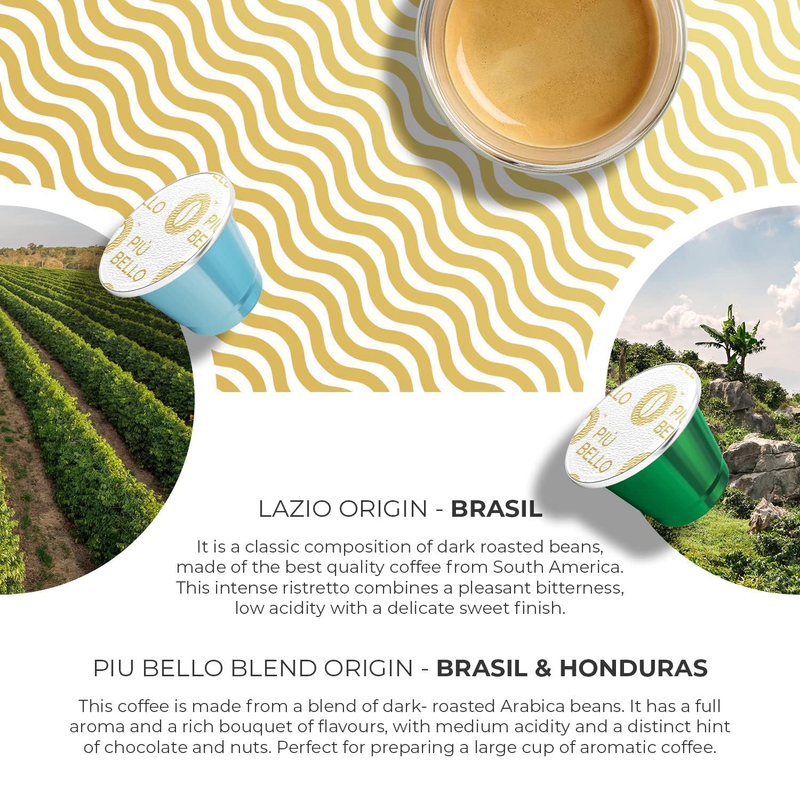 NESPRESSO COMPATIBLE PODS - Enjoy delicious cafe quality roasted coffee, brewed fast and poured steaming hot fresh directly into your awaiting cup. Piu Bello capsules are compatible with Nespresso Original line espresso machine.