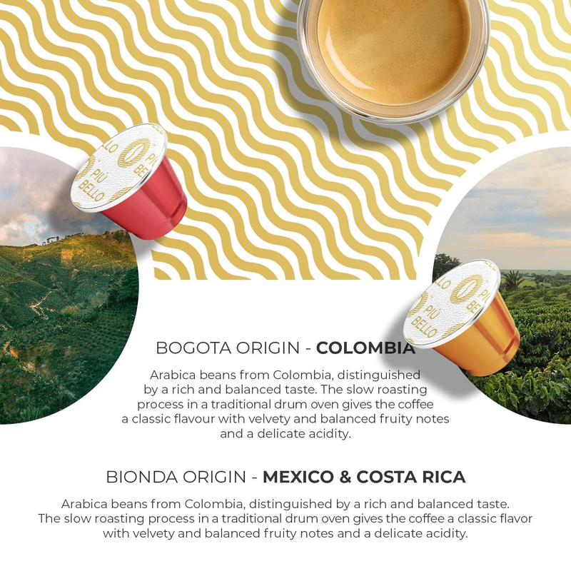 6 FLAVOR MULTIPACK COFFEE - Choose this 6 flavor multipack of Nespresso pods and enjoy every delicious variety from Piu Bello including Bogota flavor, Roga flavor, Lazio flavor, Piu Bello Blend, Espresso Bionda, and Espresso Estremo. Made from 100% Colombian Arabica beans