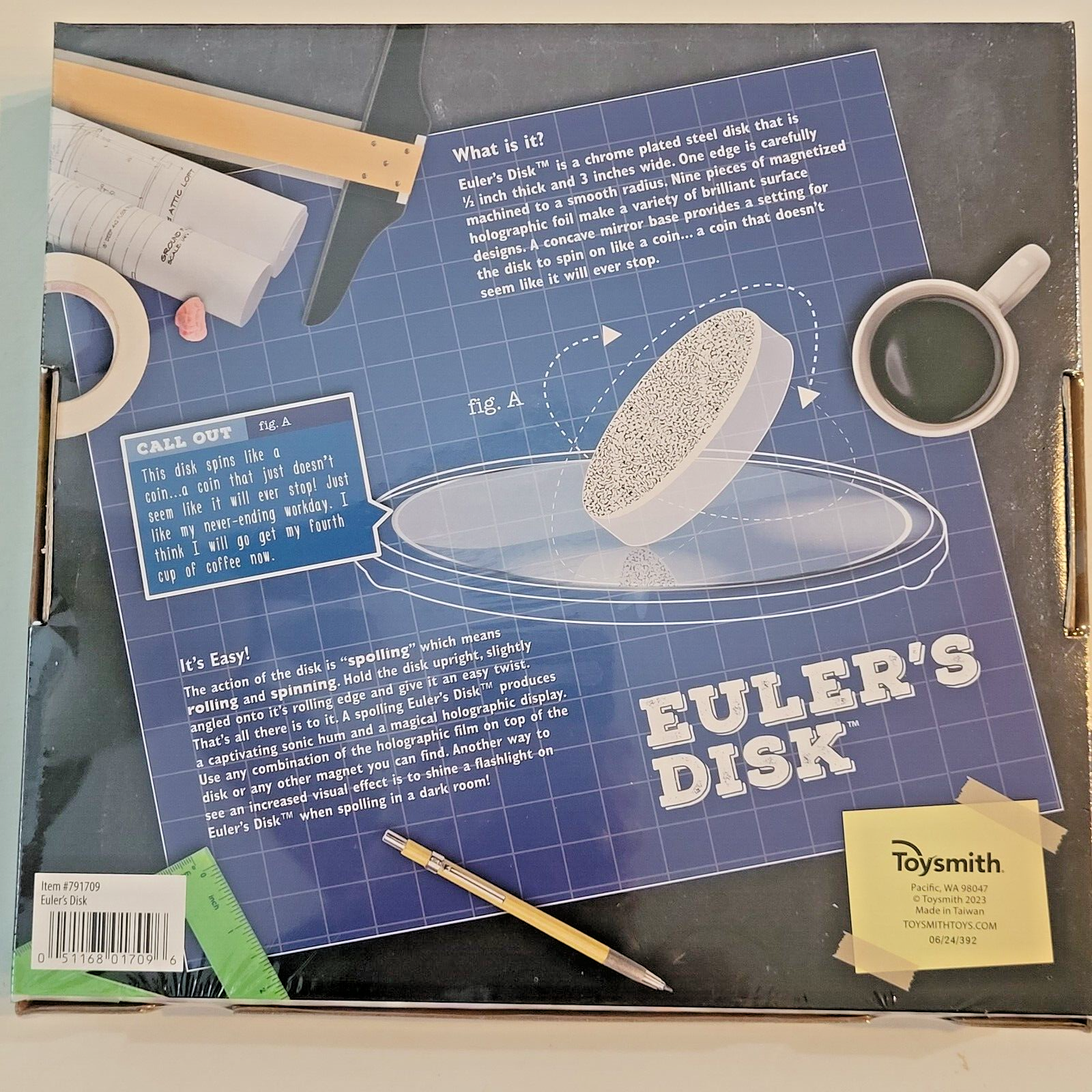 Give the Euler's Disk! This patented 3" diameter chrome-plated steel disk creates a hypnotic display of light and sound as it rotates. Includes Euler's Disk, 9" concave mirror base and nine pieces of magnetized holographic foil.