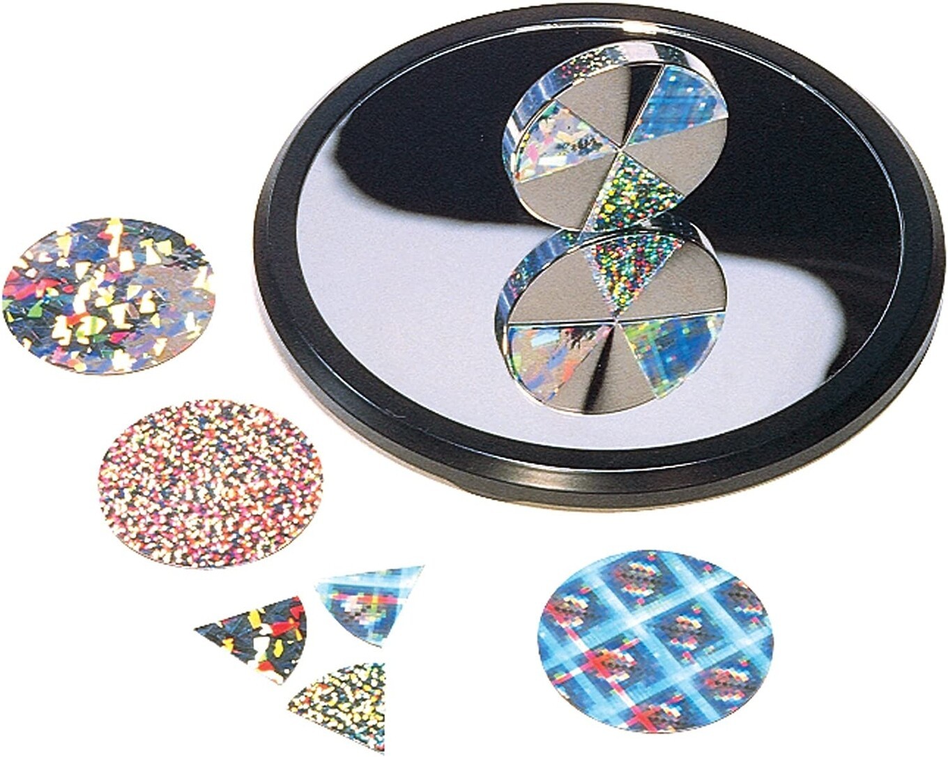 Fascinating desktop illusions! Spin the holographic disk on the mirror. Does it speed up? Listen to its rhythmic sounds. Why does the humming get louder as the speed of the disk increases? This patented 3" Diameter chrome-plated steel disk creates a hypnotic display of light and sound as it rotates. Includes Euler's disk, 9" Concave mirror base and nine pieces of magnetized holographic foil. Complete with instructions and the scientific answers!