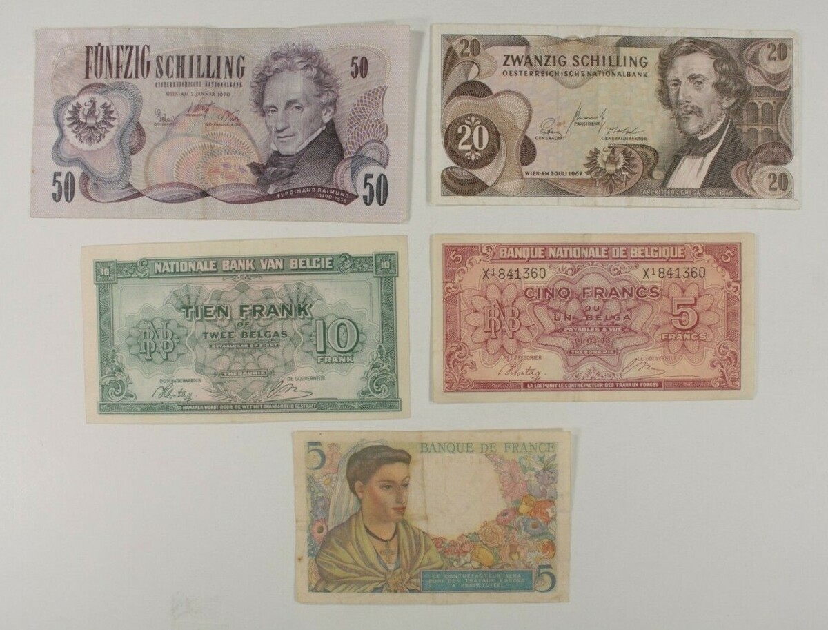 European 5-Notes Currency Lot France Belgium Francs Austria Schilling