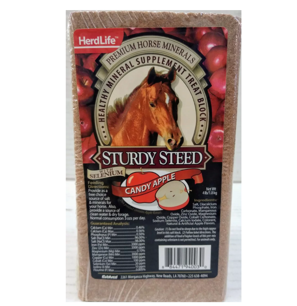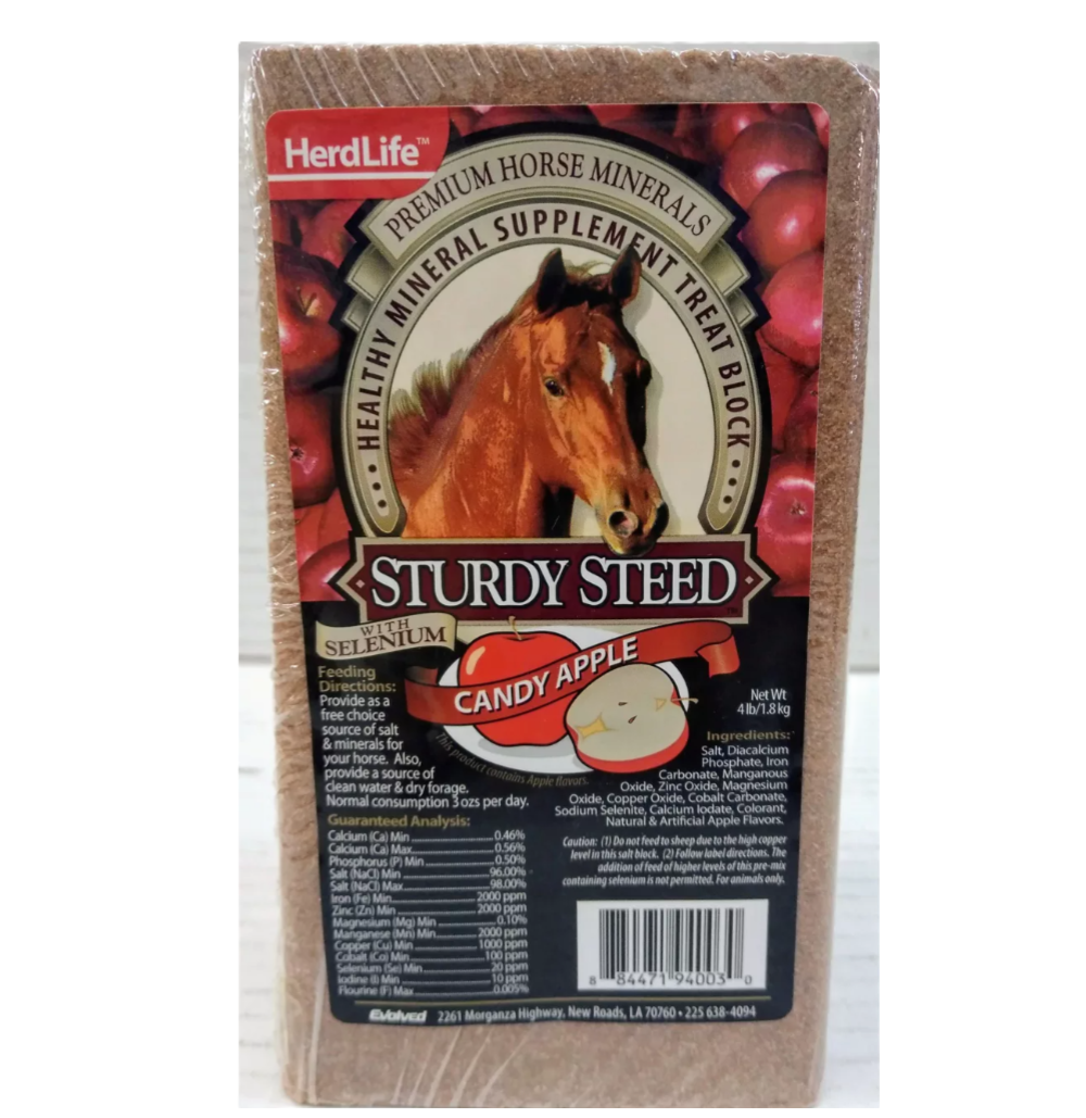 Evolved Habitats Herdlife Sturdy Steed Candy Apple horse treats are an apple-flavored mineral block with selenium that supply valuable equine minerals. These horse snacks provide a free choice basis and your horse will enjoy licking this mineral supplement until it is gone. These apple horse treats are great for horses of all ages.