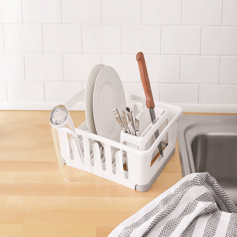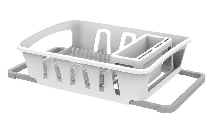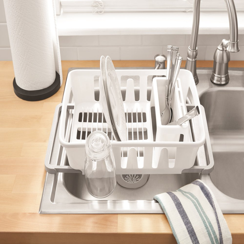 With our Mainstays Expandable Dish Drying Rack, you'll have the right kitchen tool to keep your kitchen running at maximum efficiency. Even if you have a dishwasher, it's convenient to have a dish drying rack for your morning coffee cups, for items that aren't dishwasher safe, or for items you've just used but quickly need to use again. This handy dish-drying rack fits neatly over or in your sink or on the counter and can extend in size from 14.6 inches to 18.4 inches. The main tray holds up to 14 plates and includes three slots as well as six cup holders, providing you plenty of space to keep your cutting boards, cooking knives, and serving plates cleaned up and easily on hand.