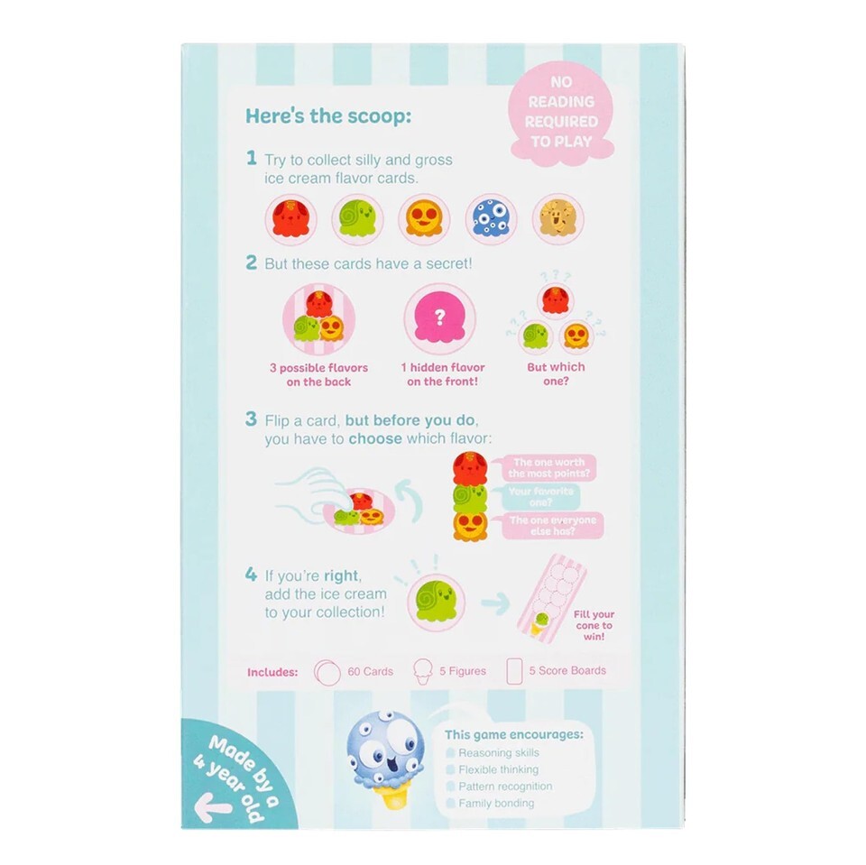 What's Included: The game features 60 cards, 5 figures, and 5 Ice Cream Cones. Perfect for creating hilarious and imaginative ice cream creations with every round.