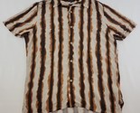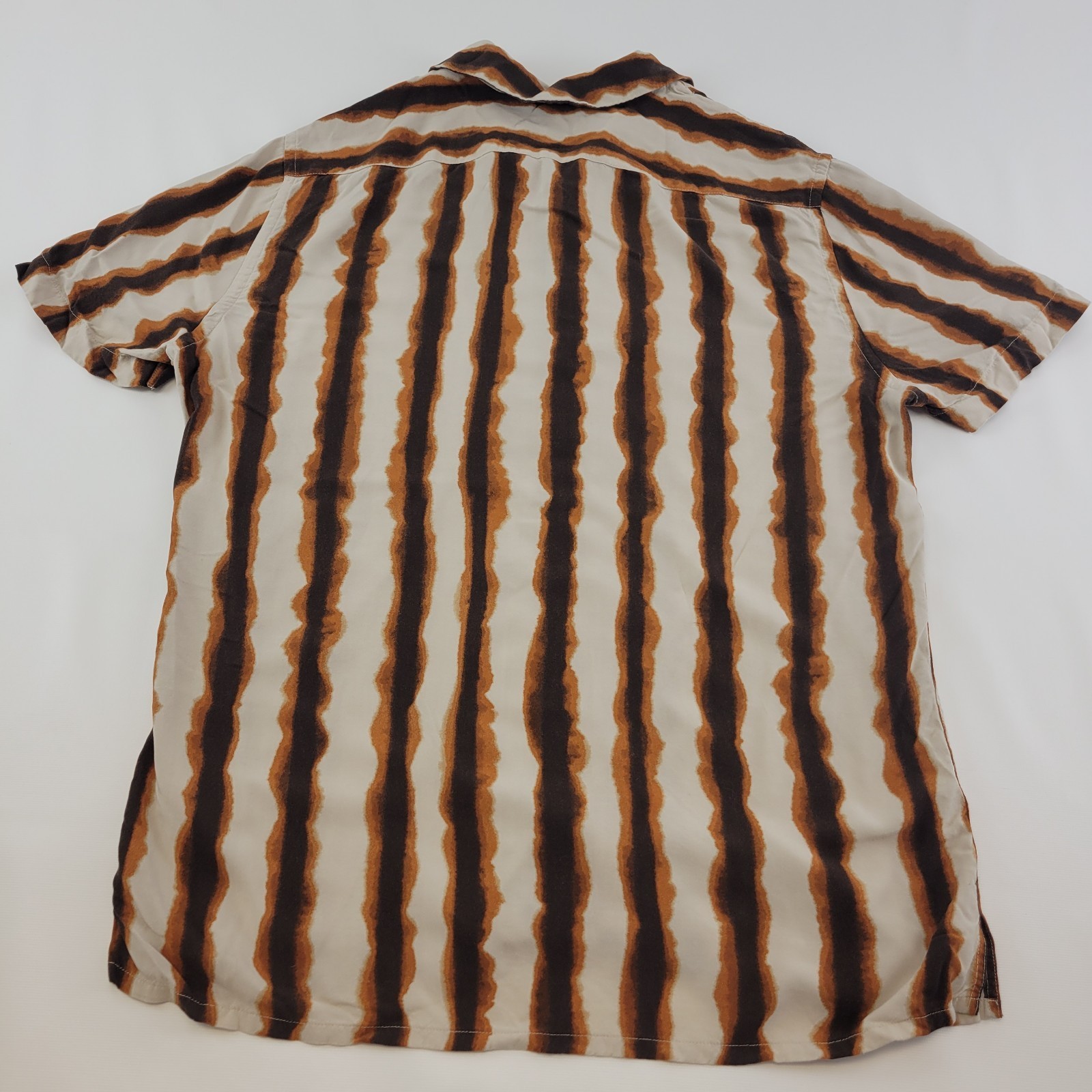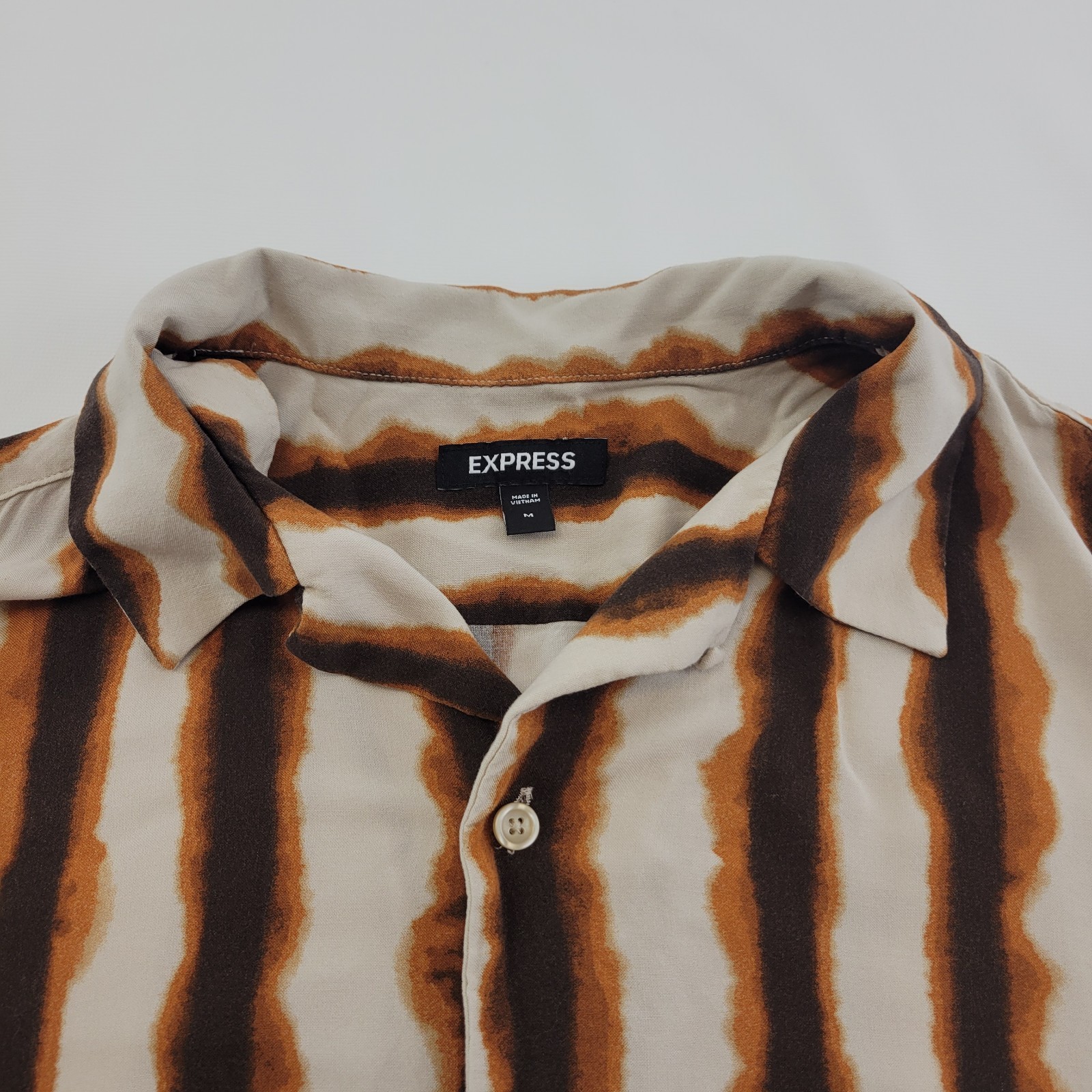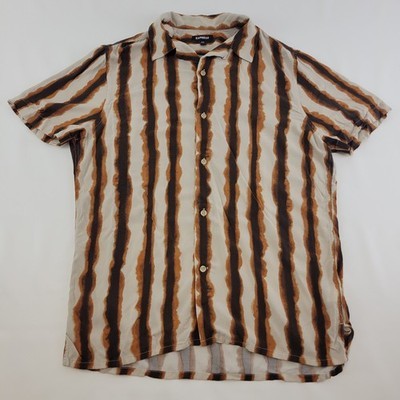 - Express Mens M Shirt Brown Beige Striped Rayon Button Front Casual Camp Collar