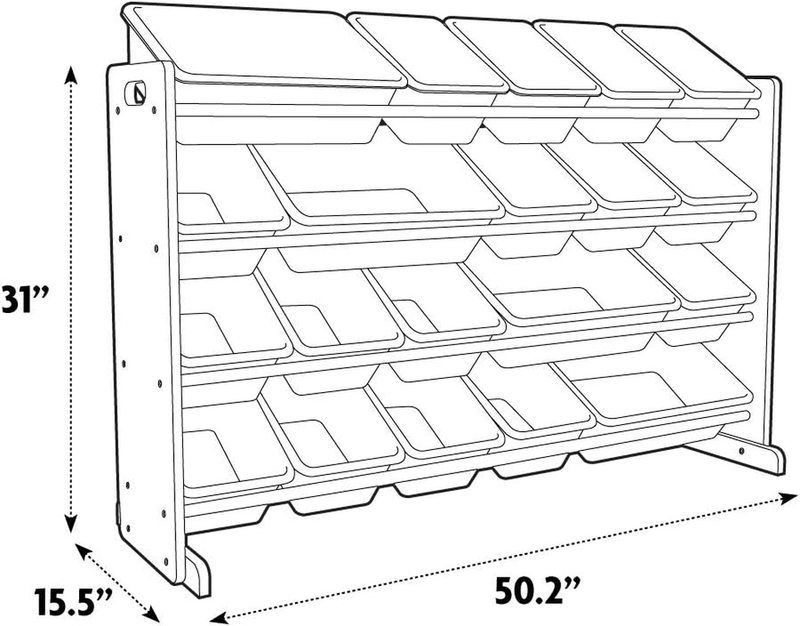 Playtime is more fun when your kids can easily take out their toys, books and games and then quickly clean up afterwards. The space-saving Humble Crew Extra Large Toy Storage Organizer with 20 Storage Bins offers 40% more storage than the leading organizer and is ideal for organizing your closet, play space, pantry, office, mudroom, child's bedroom, playroom, nursery, living room and more. The 16 standard and 4 large colorful storage containers are BPA and phthalate free and easy to remove, replace and reposition along the 4 tiered shelves. These storage bins are sized just right within the toy organizer for toddlers and preschool aged children but are versatile enough for use by adults as well. This organizer is a great toy storage box alternative and the stylish grey and white colorway makes it the perfect organizational solution for any room in the home. Made with sturdy engineered wood construction frame with stabilizing braces and steel shelving rods, each level can hold up to 20 pounds. Some assembly is required and all hardware is included. Product sizing- 51"W x 11"D (16"D with stabilizing braces) x 32"H Standard bin sizing: 12"L x 9"W x 6"H Large bin sizing: 16"L x 12"W x 6"H Additional plastic storage toy bins are sold separately.