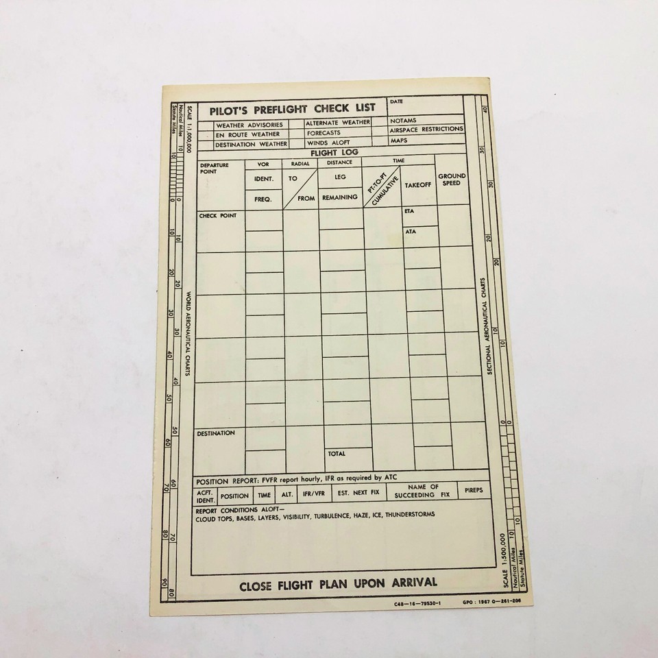Flight plan on one side and Preflight check list on the other side