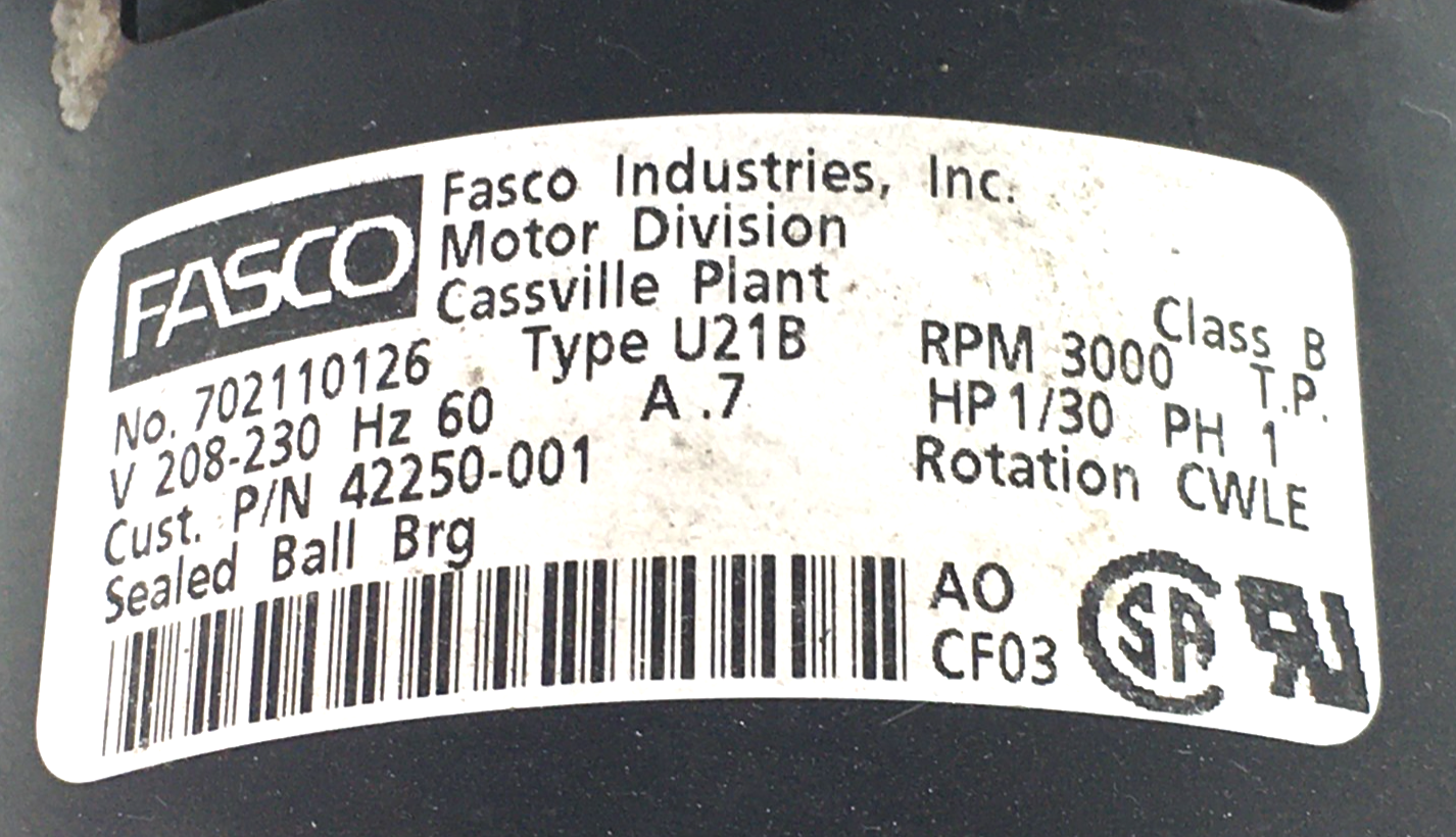 This is ASCO 702110126 Draft Inducer Motor 42250-001 208/230V 3000 RPM 1/30HP used refurbished part, both bearings are new on this motor.