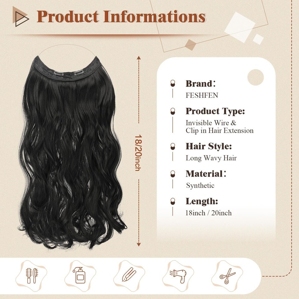 - FESHFEN Invisible Wire Hair Extensions 20" Long Wavy Synthetic Black
