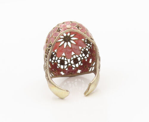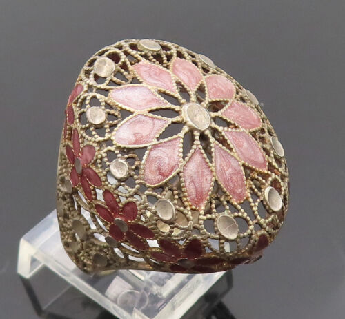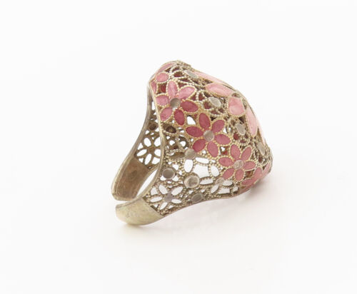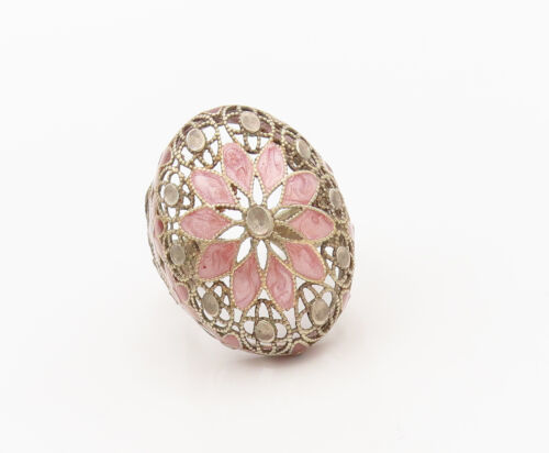 - FLORENCE 925 Silver - Vintage Floral Pink Enamel Adjustable Ring Sz 10 - RG27181