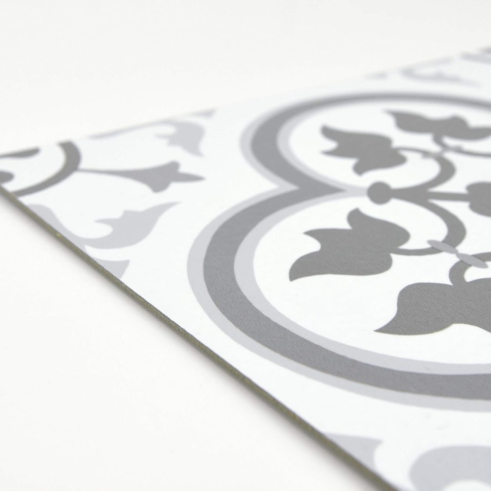 Brighten up kitchen and bathroom floors with these peel and stick tiles. A grey gothic-style motif effortlessly complements a crisp white background. Remy Peel Stick Floor Tiles Peel and Stick Tiles contains 10 pieces on 10 sheets that each measure 12 x 12 inches. This product measures 60-in x 24-in x .06-in when assembled.