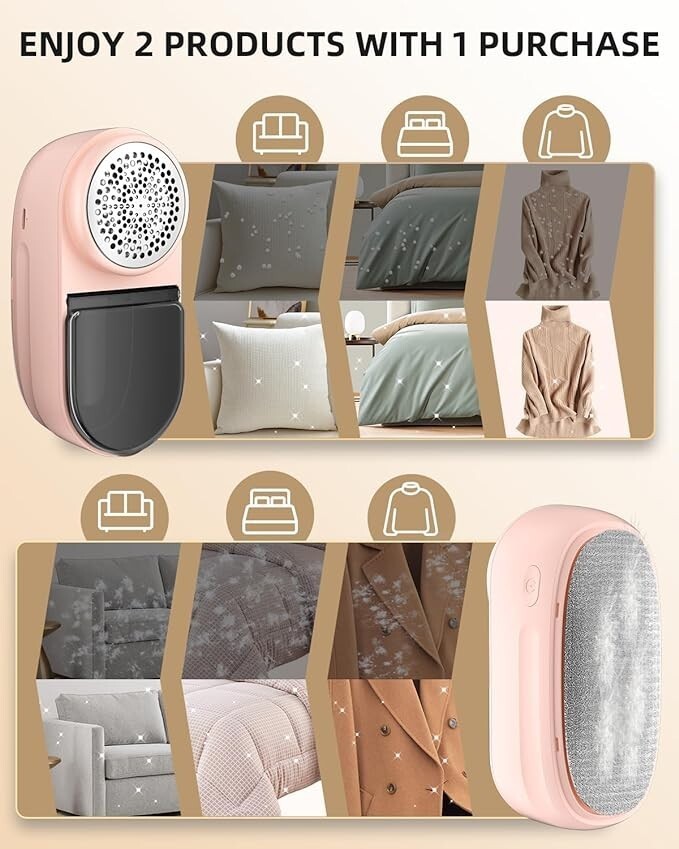 ?2 IN 1 FABRIC SHAVER? Wireless Lint Shaver and Lint Brush 2 in 1, enjoy two products for one price. The upgrade motor with the back lint brush effectively cleans pet hair, lint, and dirt from winter coat, scarf, gloves, plush toys, car cushion, sofa, leggings, bedding, curtains and linens, and other clothing or fabrics that need lint removal.