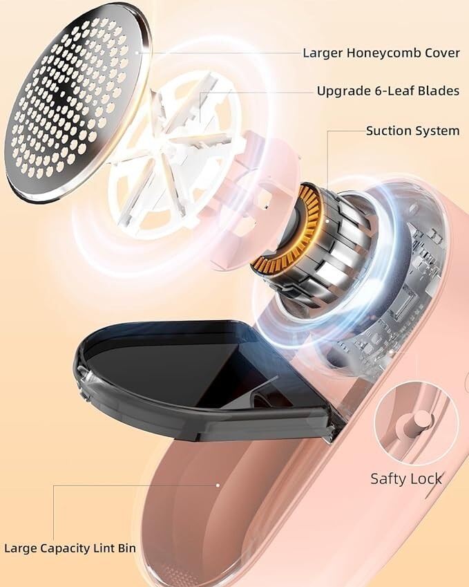 ?3 SHAVING HOLE 6-LEAF BLADES? Upgrade 3 shaving hole sizes and 6-leaf blades, our lint remover can increase work efficiency by 50%, remove fuzz pills without damaging the clothes and no hurt to the surface of the fabric. Which can meet the need of most fabric surfaces.
