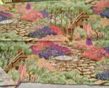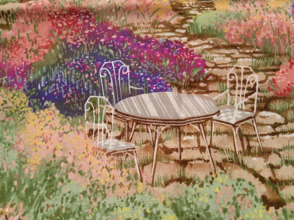 This fabric listing is by Timeless Treasures entitled "In the Garden", featuring English thatched cottages in a beautiful pastel garden of purple, coral and royal blue with wrought iron table and chairs. This is vintage material and I have only this piece left. It measures 45" x 12-1/2".