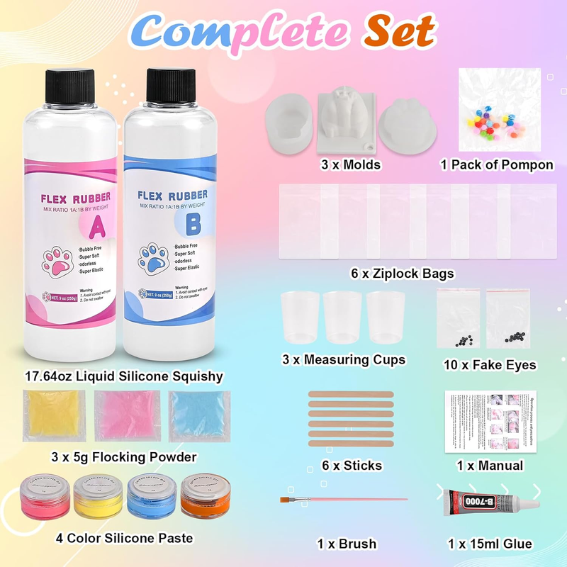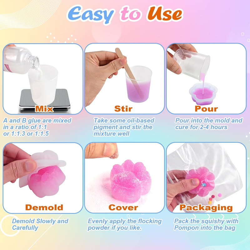 ?Effortless 3-Step Crafting?--Perfect Results Every Time! Our squishy maker kit simplifies DIY:1) Precise 1:1 or 1:1.3 or 1:1.5 mixing using included weight-matched cups. 2) Add the pigment you want during the mixing process. 3) Quick cure in 2-4 hours at 77F (33% faster than standard squishy kits) 4) Mold Release, Customize with flocking powder for taba squishy.