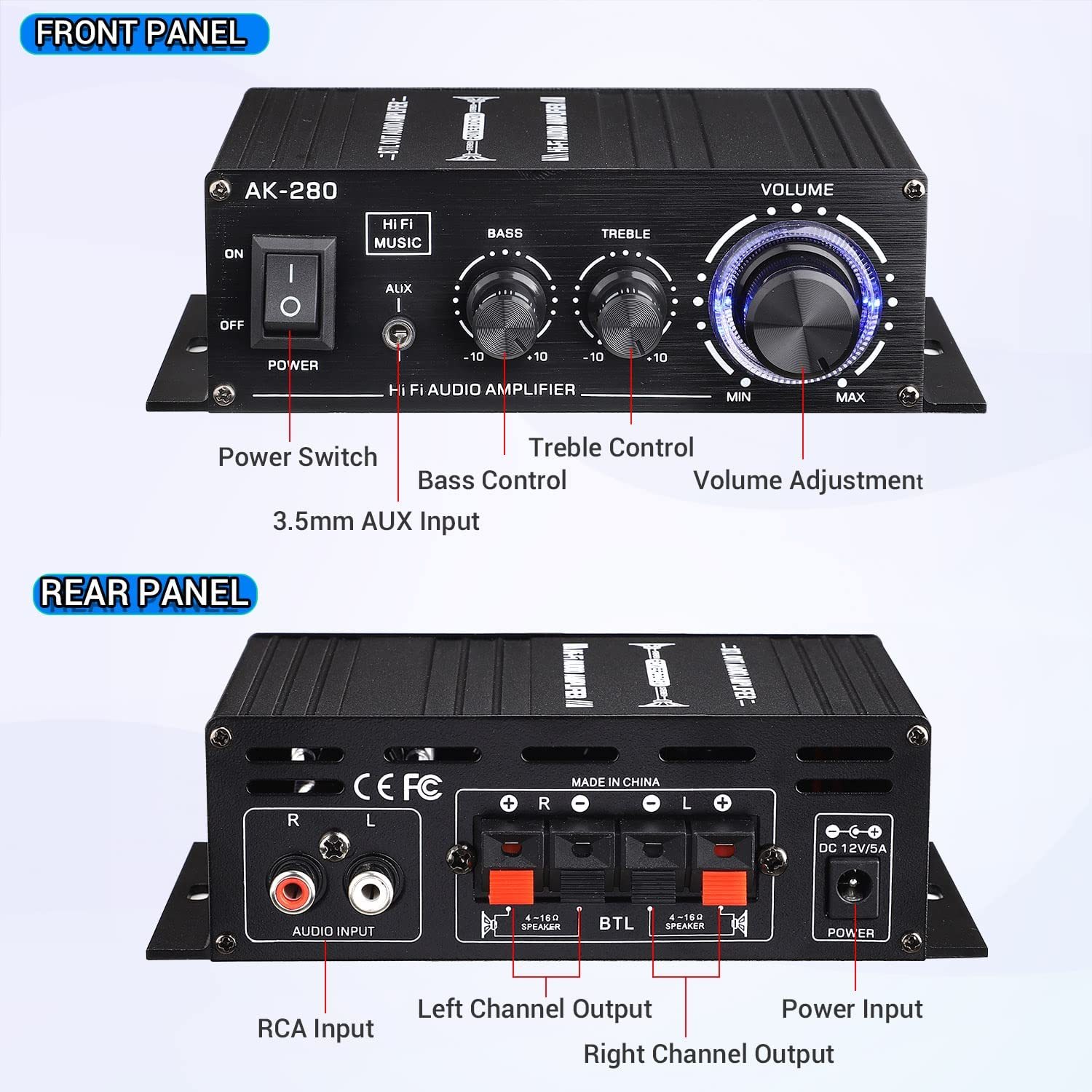 ?200W+200W Maximum Power?-- This 2 channel mini audio amplifier provides 200W+200W peak power, rated power 40W+40W, suitable for your home theater acoustic sound system or your car. With mini compact size(6.14x3.07x1.85" / 15.6x7.8x4.7cm) makes it easy to carry. Amplifier weight: 0.77pounds/0.35kg. ?Bass Treble Control?-- Knob with LED backlight design, with volume, treble and bass control knobs, which allows you to adjust the high and low frequency separately for delicate sound. ?3.5mm AUX RCA Inputs?-- It supports RCA 3.5mm AUX Input, which compatible with mobile phones, computers, tablets, notebooks, MP3, MP4, TVs and projectors with AV audio etc. This mini audio amplifier is convenient to use, you can use it at home, and carry it to your car. ?DC 12V Input?-- Include 12V 5A power adapter, this power amplifier can be used in your car, your RV, your home. It is easy to be installed in car or marine, save space and convenient to operate. ?1-Year Warranty? -- We offer 1-year guarantee period. If you have any questions or concerns, please don't hesitate to contact us. It contains 1 Power Amplifier, 1 12V 5A Power Supply, 1 User Manual.