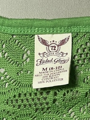 The product is a women's blouse from the brand Faded Glory, size M (8-10). It features a green color with stripes and lace detailing on the upper back. This short sleeve top is designed for regular size women and falls under the category of women's clothing. It offers a stylish and feminine look, making it a versatile addition to any wardrobe.