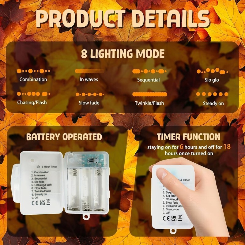 Our fall thanksgiving string lights feature a timer function, staying on for 6 hours and off for 18 hours once turned on. Choose from 8 flashing modes: combination, in waves, sequential, slo-glo, chasing/flash, slow fade, twinkle/flash, and steady on.