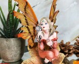 ? This autumn-hued fairy sits upon a giant leaf, gazing out in the horizons. The pixie has brown hair and wings of brown, orange, tan and yellow. Her outfit matches the butterfly wings. The pretty fae is holding a bubble stick and there she blows her wishes off so that they will come true. This figurine is sure to please any faery collector!