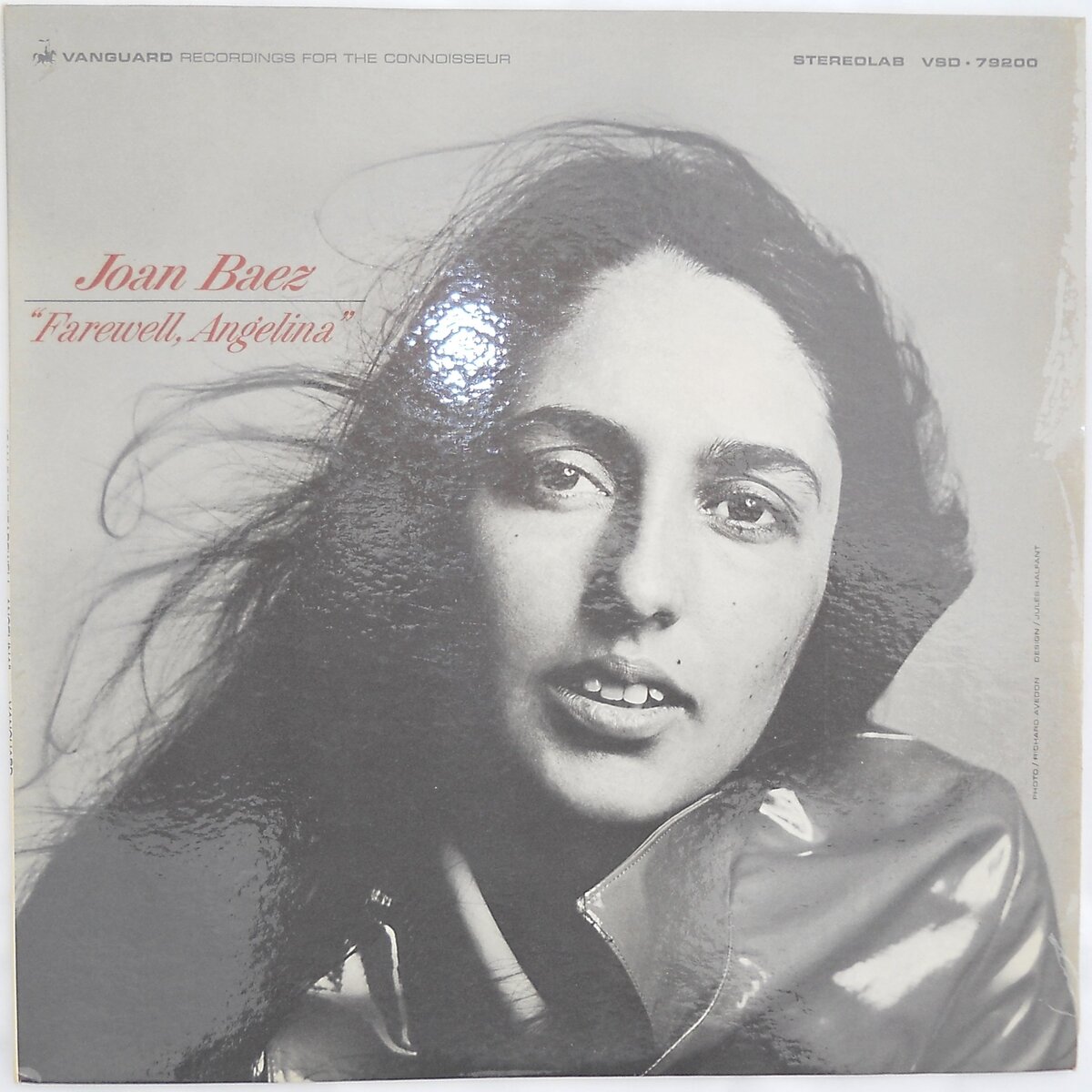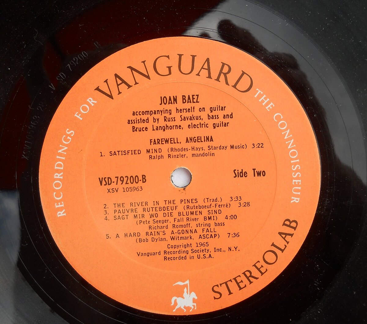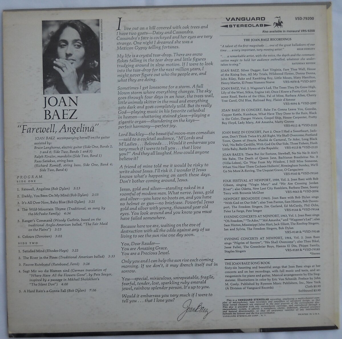 Product description: Joan Baez "Farewell, Angelina". Stereolab VSD-79200. Vanguard Recordings For The Connoisseur. (1965). Accompanying herself on guitar, assisted by Russ Savakus (bass), and Bruce Langhorne (electric guitar). Side One: Farewell, Angelina, 2. Daddy, You Been On My Mind, 3. It's All Over Now, Baby Blue, 4. The Wild Mountain Thyme, 5. Ranger's Command, 6. Colours; Side Two: 1. Satisfied Mind, 2. The River In The Pines, 3. Pauvre Rutebdeuf, 4. Sagt Mir Vo Die Blumen, 5. A Hard Rain's A-Gonna Fall.