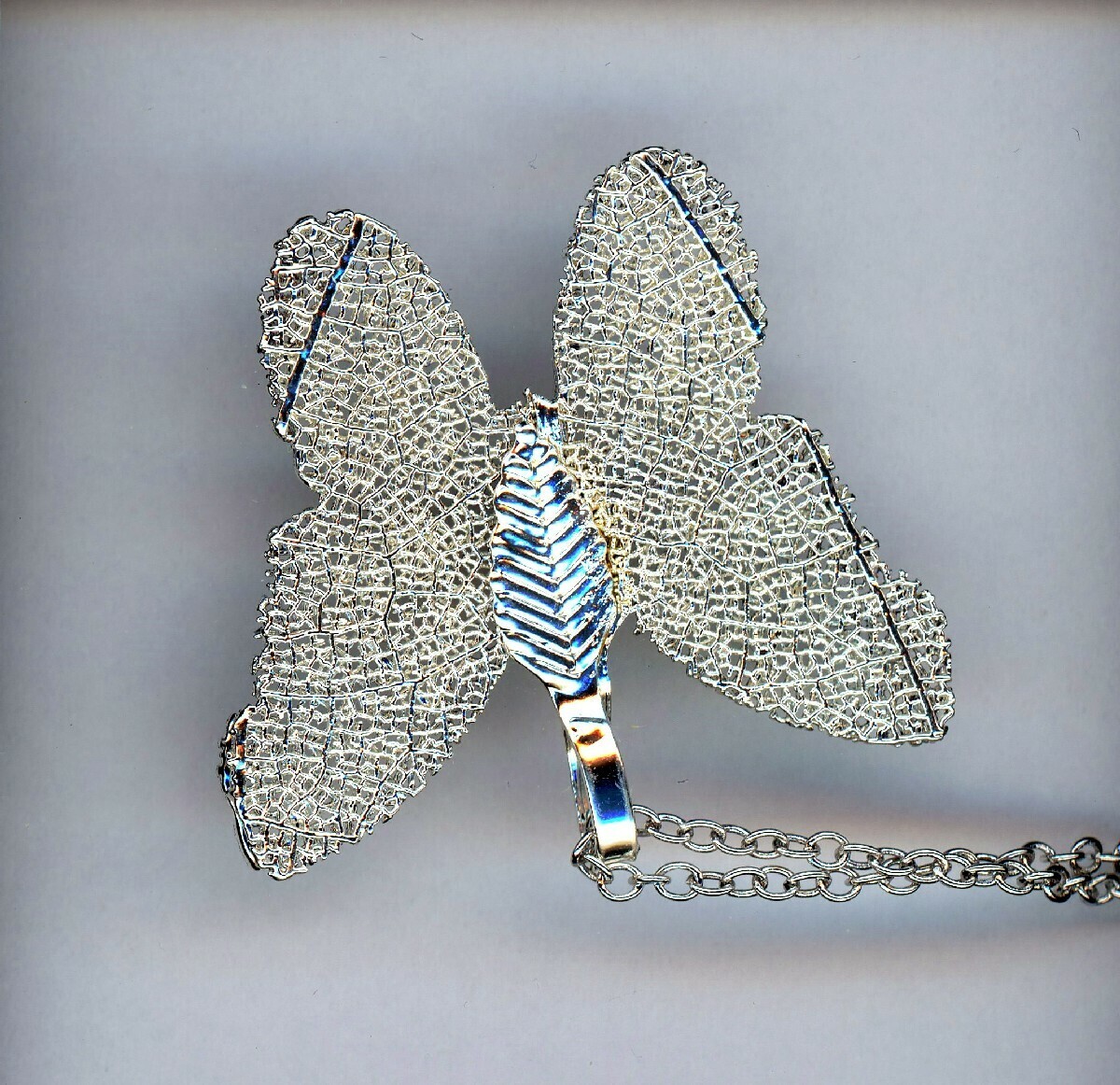 Fashion Handmade Blue Gray Colored Butterfly with Wings with micro sized Rhinestone Necklace This necklace piece is silver in color and WING shaped. All done with a Silver chain of 18 inches. A Beautiful Creation.