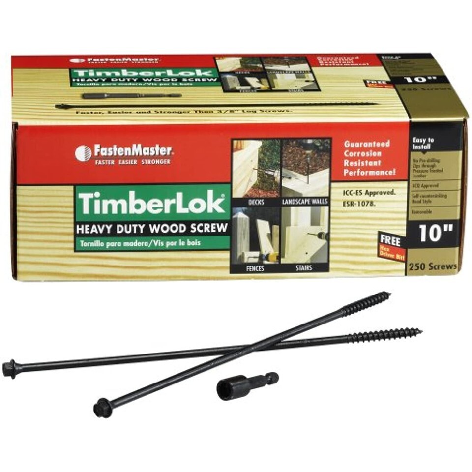 Product Description Fasten master, 250 pack, 10 inch timberlok screw, no pre-drilling required, timberlok drives right through pressure treated wood, faster, easier stronger than a 3/8 inch lag screw, self countersinking removable, good for deck, landscape walls, fences stairs. From the Manufacturer Save time, money, and labor costs. TimberLOK's sharp point and aggressive threads penetrate the densest woods without predrilling and provide stronger shear values than 3/8 inch galvanized lag screws. TimberLOK's unique countersinking head design is perfect for your next wood-to-wood project, whether it be deck framing, fencing, or any post to beam connections. It?s also perfect for replacing galvanized spikes in raised flower beds, landscaping, or retaining walls. No need to predrill and sledge a spike. TimberLOK just zips right in. Each pack size contains a free 5/6 inch driver bit. TimberLOK fasteners are American made.