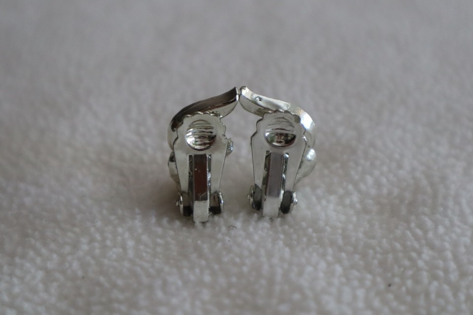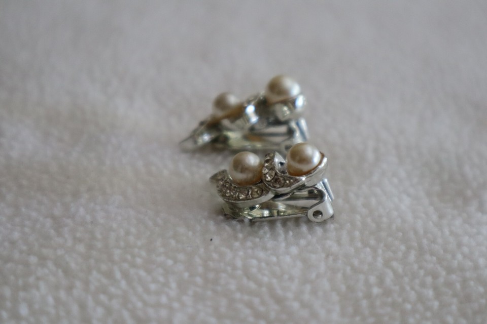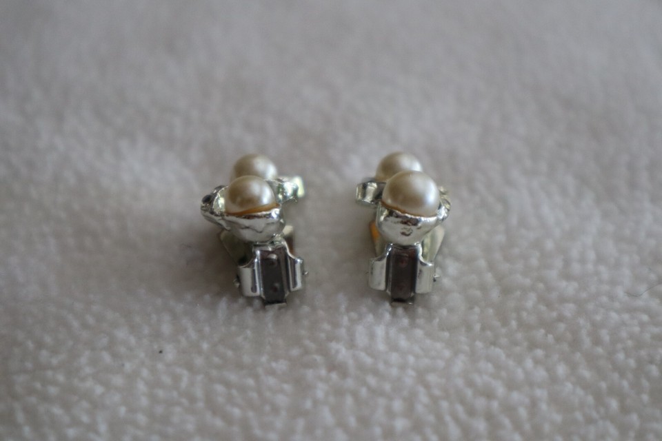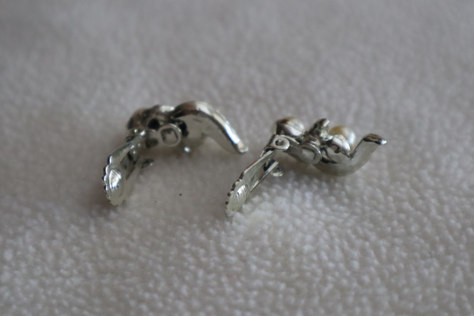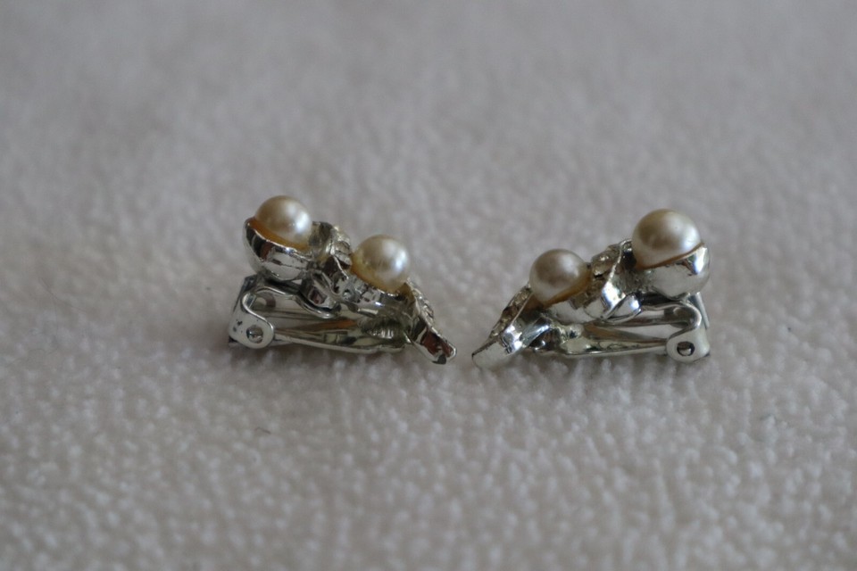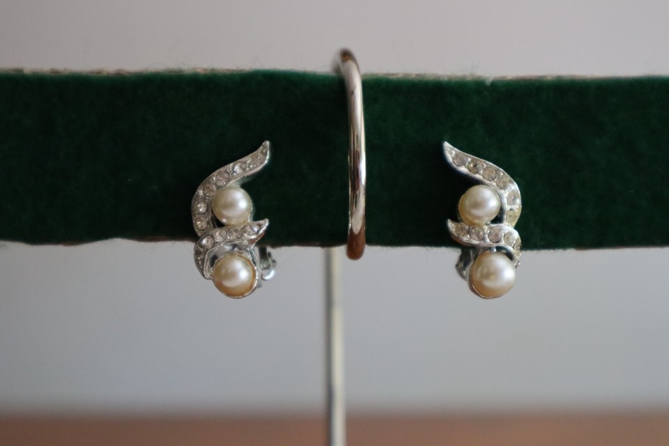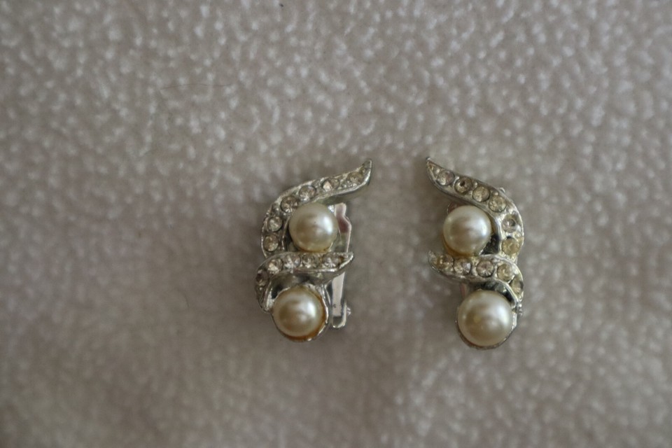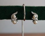 - Faux Double Pearl Rhinestone Swirl Drop Clip On Silver Toned Elegant Classic