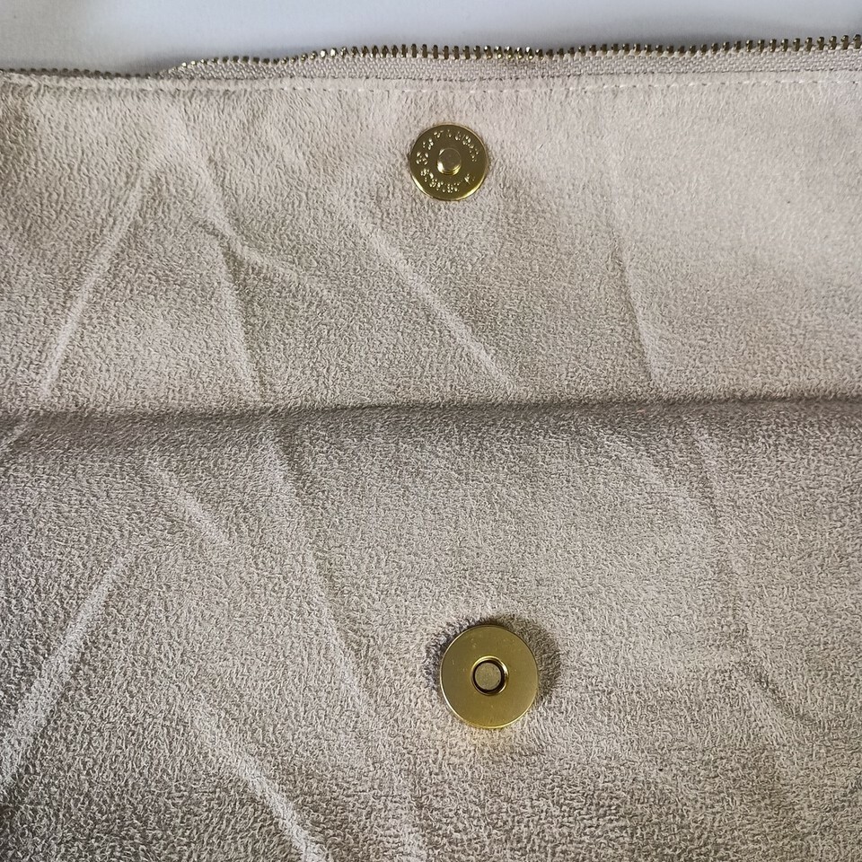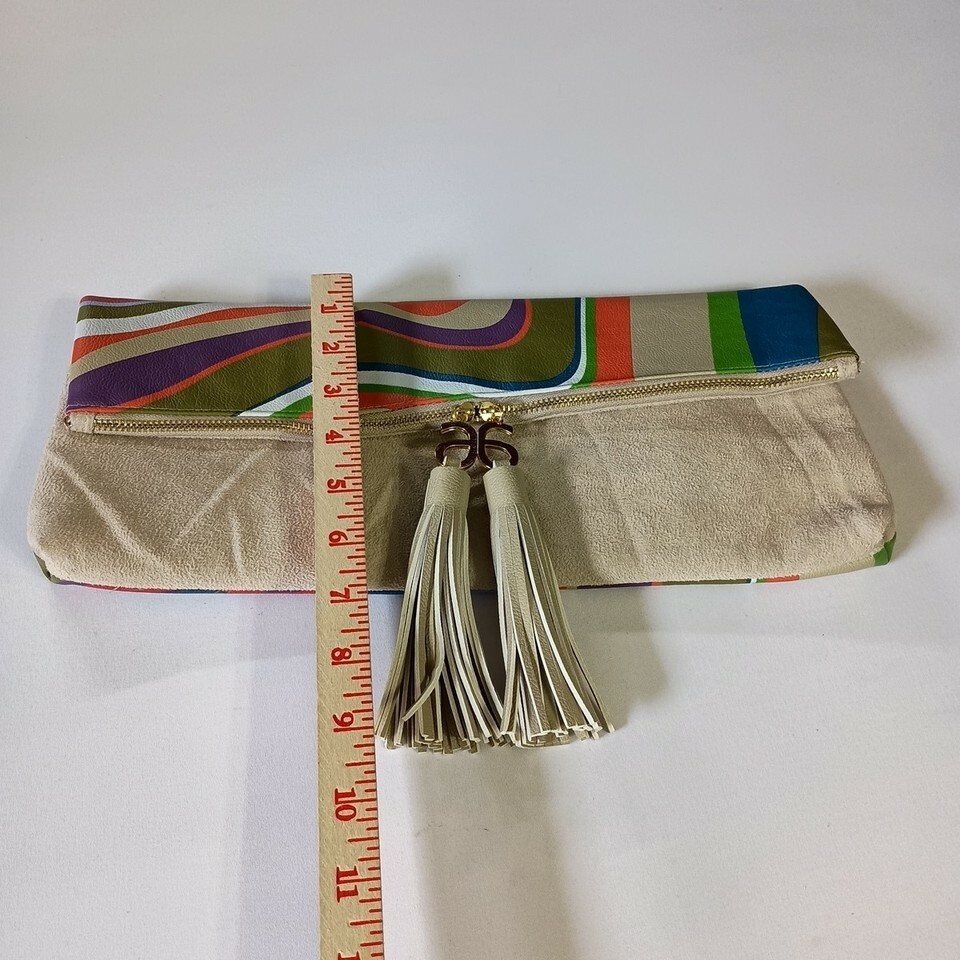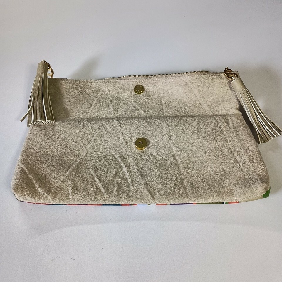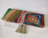 The Arbonne Treasures Of The Rainforest Faux Leather Clutch Cosmetics Bag is a stylish and versatile accessory for women. Made from vegan leather with a geometric pattern and tassel accents, this small rectangular bag features a zip, magnetic, and snap closure for security. The multicolor exterior and gold hardware add a touch of elegance, while the lightweight design and lined interior make it practical for travel or casual outings. With its colorful theme and quality construction, this clutch is a must-have addition to any wardrobe. Normal wear. Sizes are approximate.