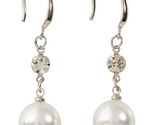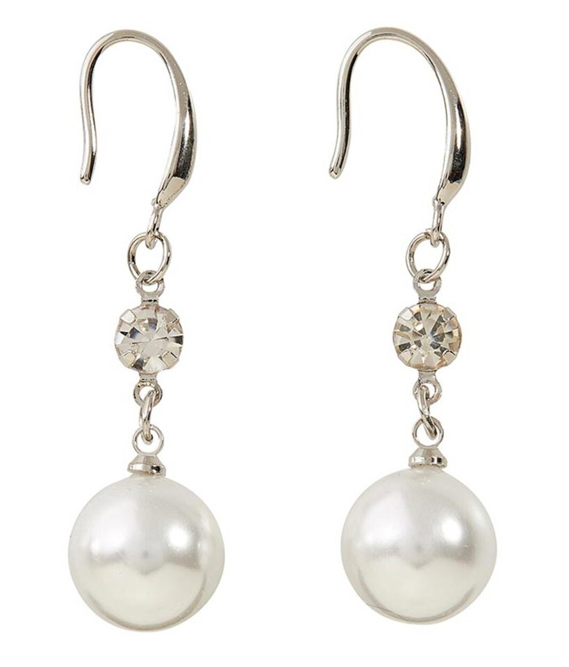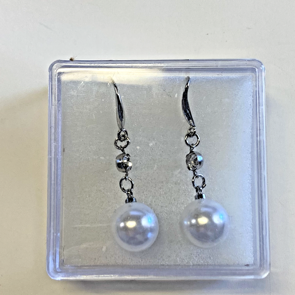 Your purchase is for a pair of faux pearl dangle silver tone earrings.