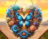 This vibrant 8-inch heart-shaped wall or window panel features a stunning blue butterfly surrounded by colorful flowers. Crafted from clear acrylic with a printed design, it captures the look of stained glass without the weight or fragility. A perfect piece to brighten up your home, patio, or sunroom.