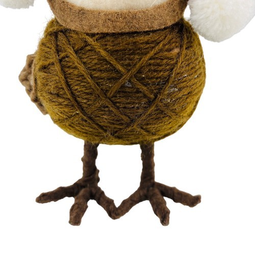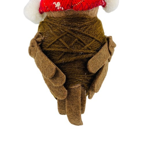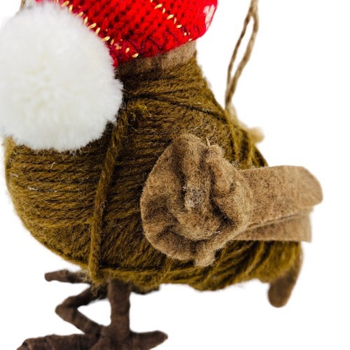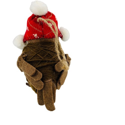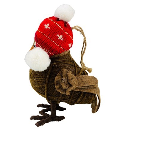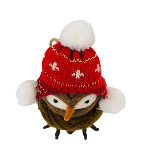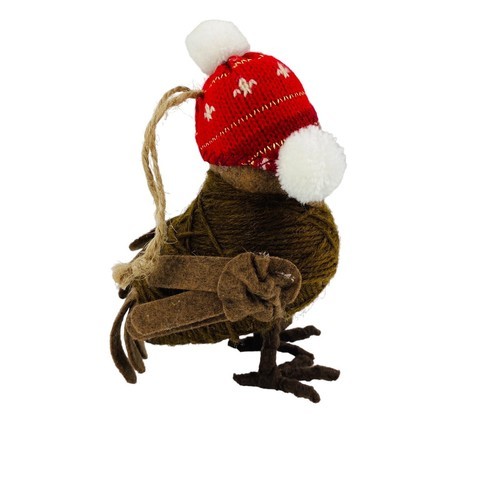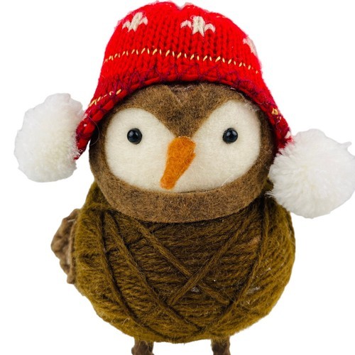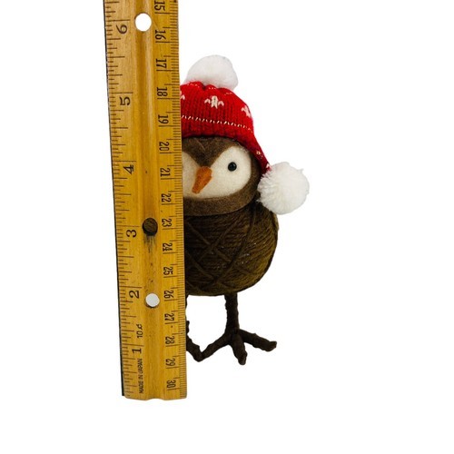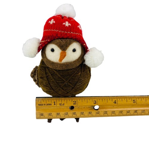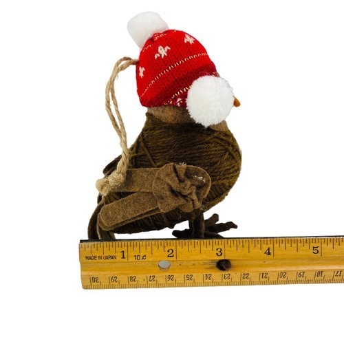 Adorable 5 inch bird ornament featuring a dark brown sparrow type bird with a cream face and orange beak wearing a red and white knit winter hat with white pompoms. The ornament, crafted from yarn and felt, has no tags but appears to be from Target?s Featherly Friends / Spritz / Wondershop collection. The design looks similar to a 2013 version, but this bird is smaller and has a twine hanging loop on the back. The ornament is in very good preowned condition. From a smoke-free home. Ships next day!