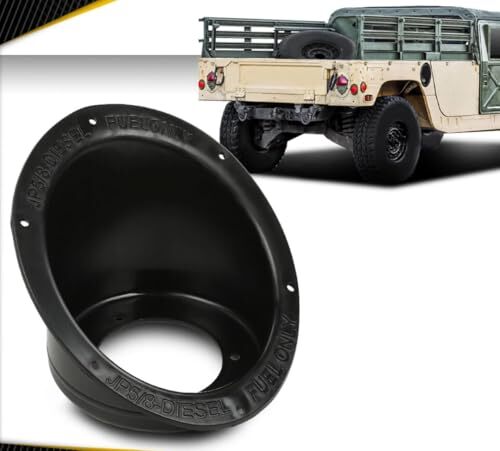 Fuel filler housing surround for military vehicles including all models of HUMVEE and1992-1995 Hummer H1s. New black fuel tank filler neck.