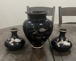This stunning vase set features a beautiful hand-painted autumn leaf pattern on a glossy black glass surface. One piece is signed by renowned artist Dane Fredrick and is an original production style art glass by Fenton. With the large vase measuring 9-1/2 inches in height and 7 inches in width, this vintage vase set is perfect for displaying on a console or as a centerpiece on a table.