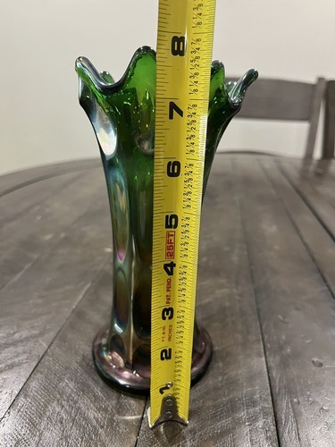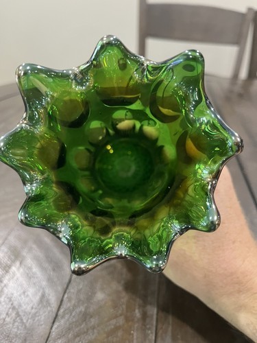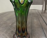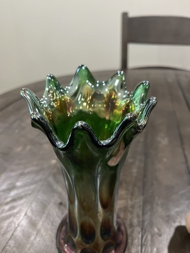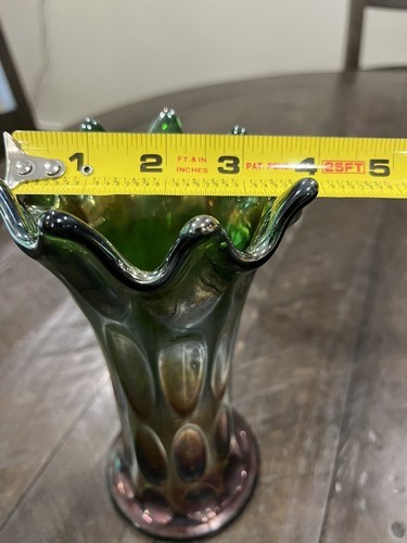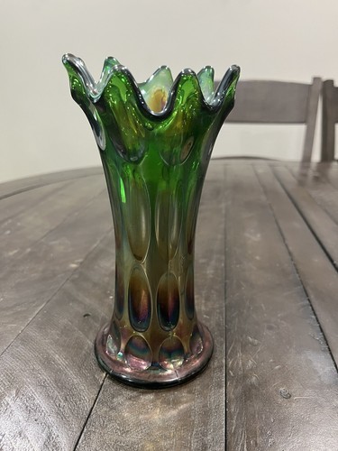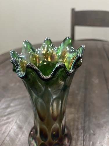 - Fenton Carnival Glass Vase Iridescent Green Long Thumbprint Swung 9 Point