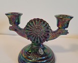 The Fenton Glass 7676 Amethyst Carnival Glass Double Armed Candle Holder is a rare vintage piece from the United States. This handmade glass candle holder features a glossy finish and is suitable for taper/dinner candles. The design incorporates elements of animals and flowers, typical of Fenton's production style. No chips or cracks. Excellent Condition