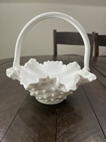 - Fenton Milk Glass Wave Hobnail Basket Large Vintage Double Ruffled Edge 8”