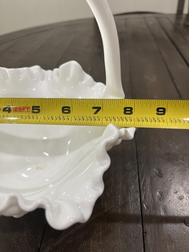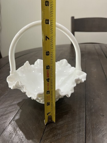 This Fenton milk glass basket is a large, vintage piece with a double ruffled edge and a diameter of 8 inches. It is perfect for decorative purposes, featuring a beautiful white color and made of high-quality glass material. The production style is milk glass and it has a height of 8 inches, making it a great addition to any collection. The basket is branded Fenton and is perfect for those who appreciate vintage decor.