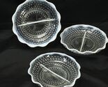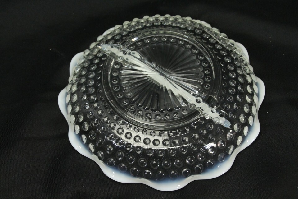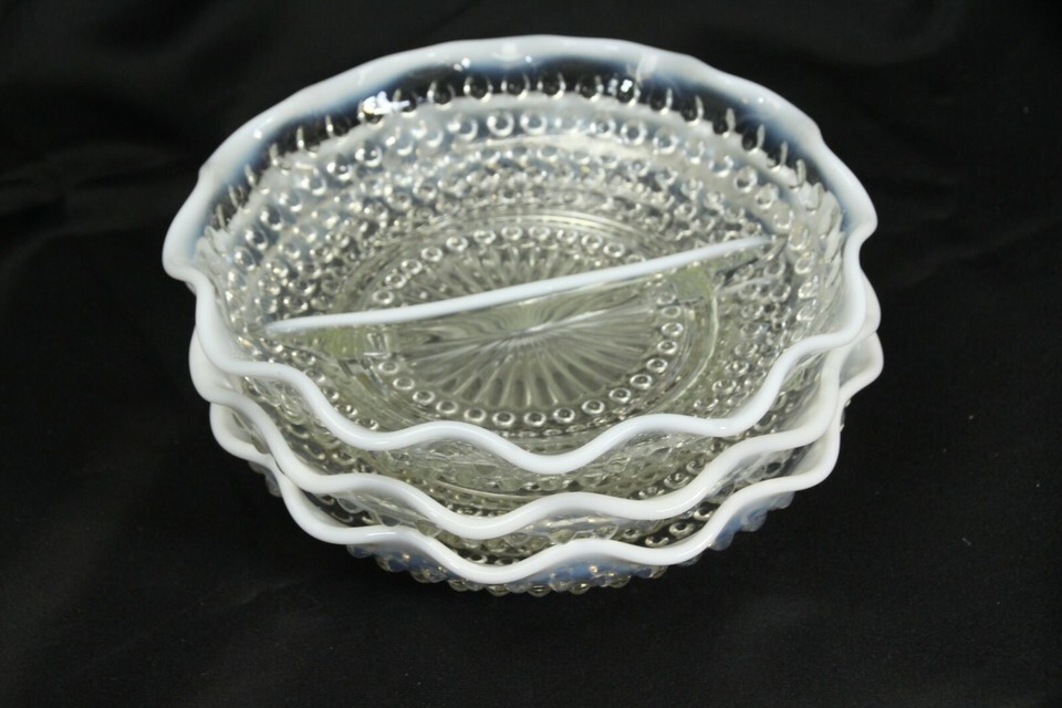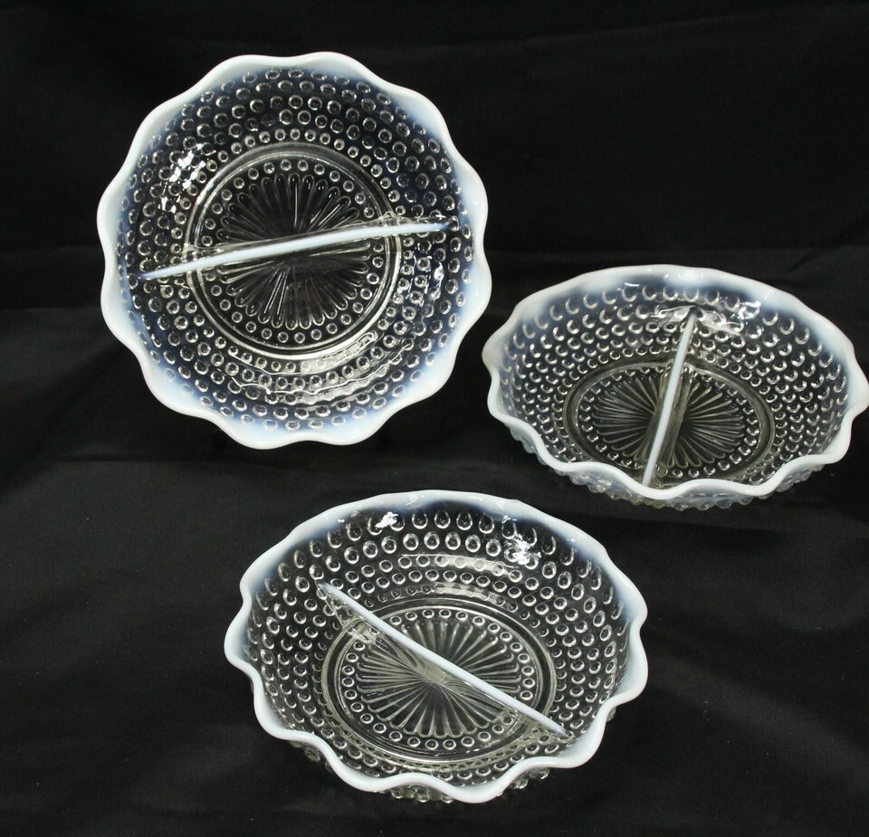 - Fenton Opalescent Glass Moonstone Hobnail Divided Dish 7 1/2" Lot of 3