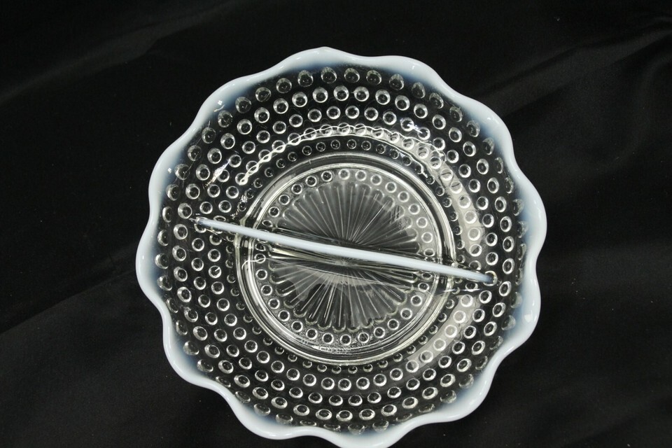 Fenton Opalescent Glass Moonstone Hobnail Divided Dish 7.5"