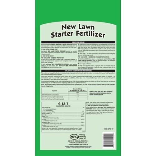 New Lawn Starter 9-13-7 is designed to help grass seed and sod develop roots and mature stems before rapid growth begins. Active ingredients: Nitrogen 9%, Available Phosphate 13%, Soluble Potash 7%, Boron 0.02%, Copper 0.05%, Iron 0.10%, Manganese 0.05%, and Zinc 0.05%.