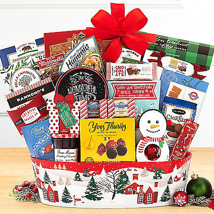 Enough for a big family, a holiday party or to pass around the office. A large assortment of dark chocolate peppermint truffles, cracked peppercorn crackers, strawberry preserves, hummus, walnut cookies, vanilla fudge with sea salt, Godiva milk chocolate truffles, Ghirardelli milk and dark chocolate peppermint bark, hot cocoa, a chocolate brownie and more arrive in this unique gift basket, decorated with a quaint holiday scene and finished with a festive bow.